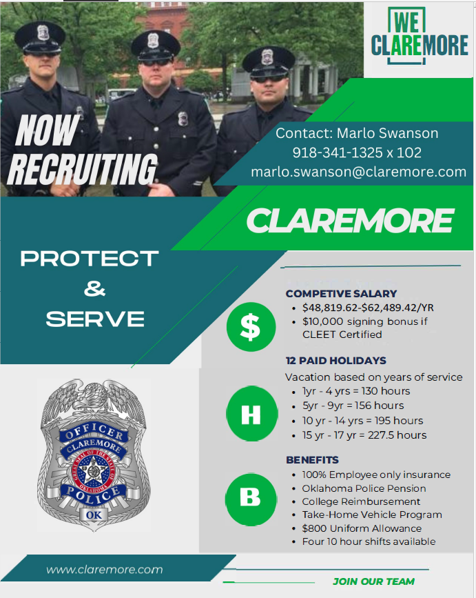 To maintain peace for City of Claremore by patrolling, enforcing and investigating city ordinances, State and Federal laws. This is a safety sensitive position and is subject to random drug testing. Safety sensitive positions must comply to federal regulations where marijuana still remains illegal. Possession of a medical marijuana license does not exempt safety sensitive positions from federal regulations. Should one of these safety sensitive positions test positive on a drug test and lose the ability to perform within the job description outline, the City of Claremore will implement the zero tolerance policy resulting in immediate termination.